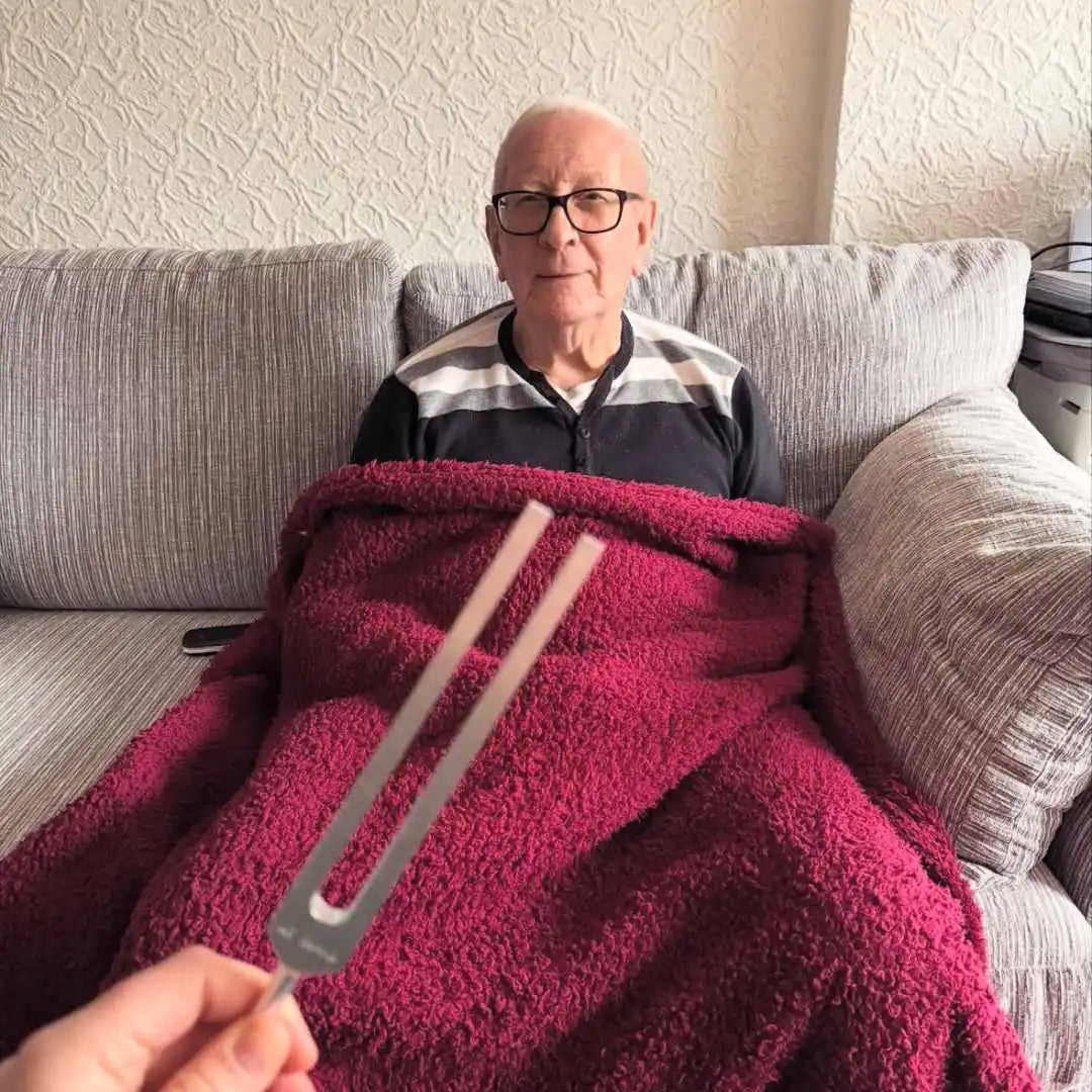 Massage therapist couldn't fix my shoulder after 10 years. Friend showed me the 128Hz fork - put it right on the knot. Felt it melt in 30 seconds. Use it every night now. Finally sleeping on my right side again. Why didn't I know about this sooner?