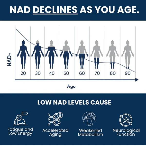 As we age, our NAD+ naturally declines — leading to fatigue, slower recovery, and visible signs of aging. By replenishing your NAD+ with high-purity NMN, you’re giving your body the tools it needs to fight back against aging and stay energized, focused, and strong.